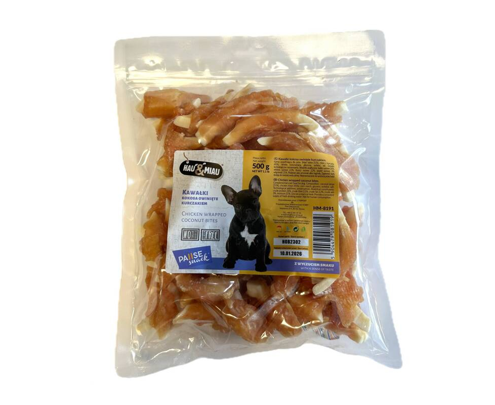 | Hau Miau suņu kārums 500g - vistas gaļā ietīti kokosriekstu gabaliņi. Bez glutēna