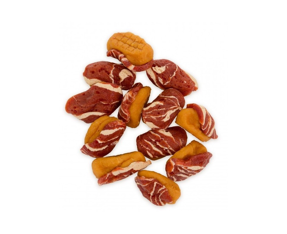 Apvienojot augstākās kvalitātes laša un pīles gaļu, šis kārums nesatur mākslīgās piedevas, [