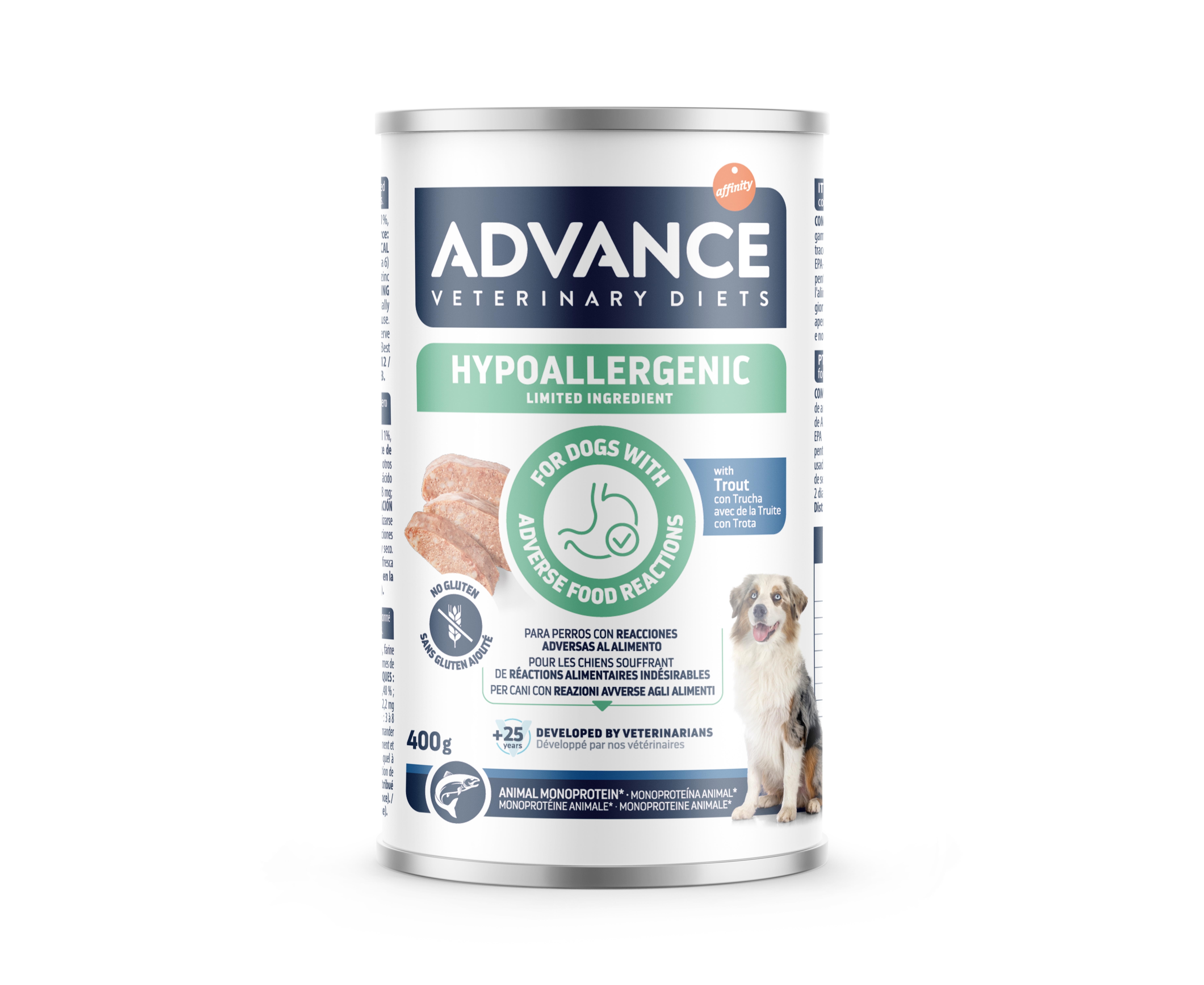 | ADVANCE VETERINARY DIET DOG Hypoallergenic TROUT 400gr - pilnvērtīga un sabalansēta diētiska mitrā barība, kas paredzēta visu izmēru suņiem ar alerģiskām reakcijām uz barību.