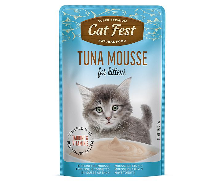 | Cat Fest konservid. Kitten tuunikonserv, 70g - niiske lisatoit tuunikalaga, pehme pürettud tekstuur, ideaalne väikestele kassipoegadele. Koostisosad: Tuunikala 58%, kalapuljong 39.9%, ansjoviseõli, prebiootikumid FOS, E-vitamiin, tauriin, tapioka, siguriekstrakt, fruktoos, mineraalained. Analüütiline koostis: koguvalkude sisaldus 10%, rasvasisaldus 0.8%, kõik kiudained 1%, tuhahulk 1.5%, niiskus 89%, energiasisaldus — 41,96 kcal. Kasutamine: Ideaalne iga tõugu kassipoegade igapäevaseks lisatoiduks. Serveeri toatemperatuuril. Hoida jahedas, kuivas kohas. Soovitatav on anda 2-3 pakki päevas sõltuvalt kassipoja vanusest ja aktiivsuse tasemest. Vajalik on pakkuda juurdepääsu värskes vees. |