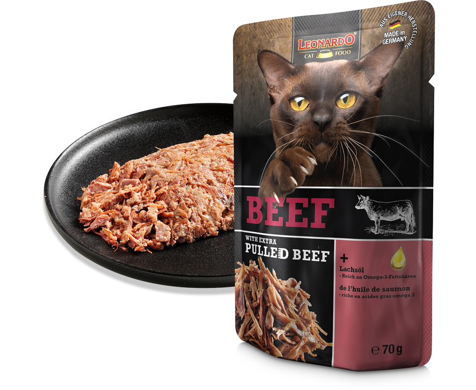 Leonardo Pulled Beef konservi kaķiem - augstākās klases liellopa pastēte ar plēstiem liellopa gabaliņiem. Jauna pieredze Jūsu kaķim ar katru kumosu