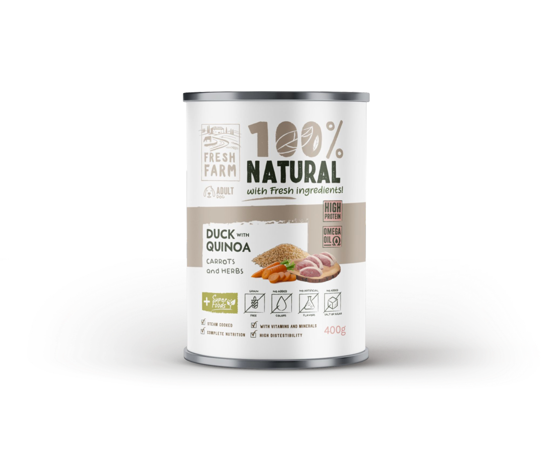 Fresh Farm DOG Coarse pate duck, quinoa, carrots & herbs 400gr - rupjas konsistences pastēte, pīles gaļa, kvinoja, burkāni un garšaugi