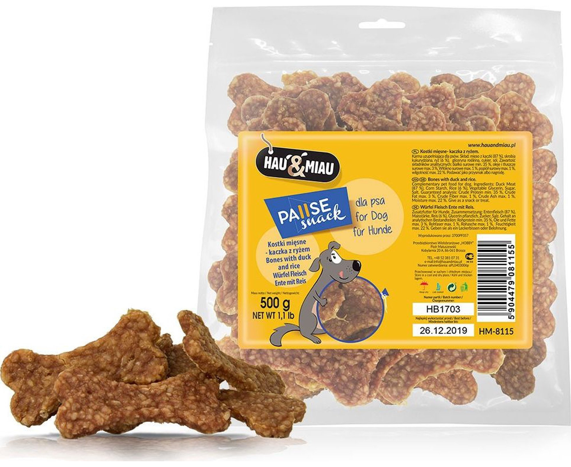 HAU&MIAU meatbonеs with duck and rice 500g - дополнительный корм для взрослых собак, вкусные мясные косточки с уткой и рисом